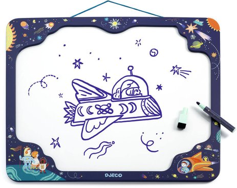 Includes a wooden board with a metal sheet, delivered with an erasable marker that allows your child to draw and practice writing and counting. It is illustrated with a rocket and planets.