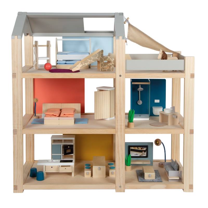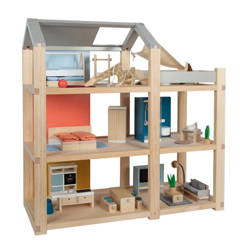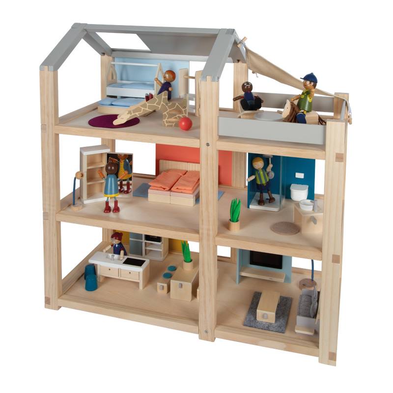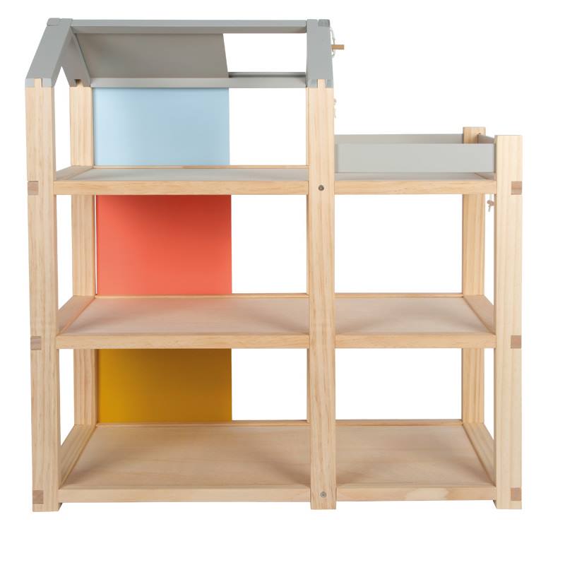 Cette maison de poupées en bois moderne s'étend sur trois étages et offre une terrasse spacieuse sur le toit. Les parois arrière coulissantes et réversibles permettent aux enfants de remodeler sans cesse leur maison de poupées pour en modifier l’apparence selon leurs envies. La surface du toit de la maison de poupées peut également être déplacée, ce qui permet aux enfants de décider eux-mêmes de l'emplacement de la fenêtre. Cela stimule non seulement la créativité dans le jeu, mais aussi l'imagination spatiale.