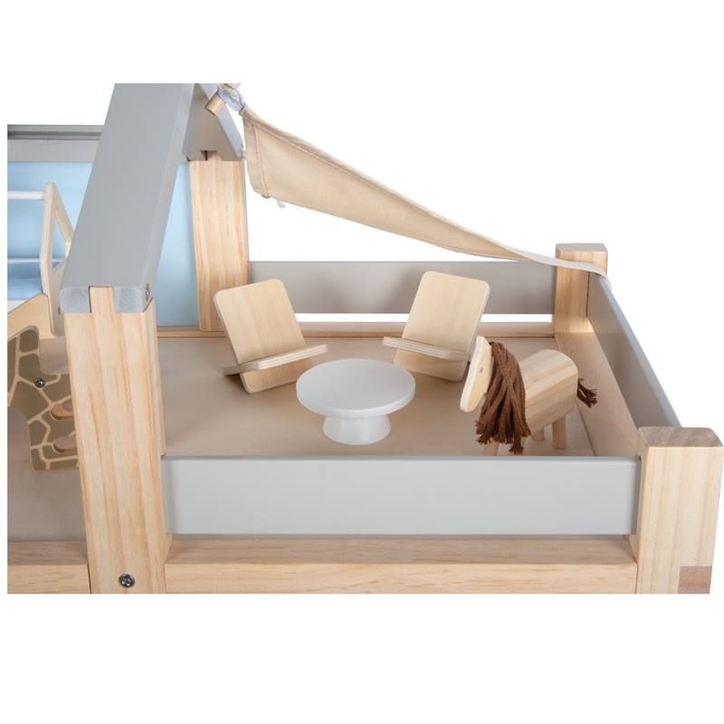La maison est entièrement équipée de nombreux meubles de maison de poupées aux détails soignés qui donnent vie à chaque pièce. Aucun accessoire supplémentaire n'est nécessaire, cette maison de poupées est immédiatement prête pour jouer ! Il y a une chambre à coucher confortable, une chambre d'enfant colorée avec un toboggan girafe, une salle de bain élégante, une cuisine moderne, une charmante salle à manger et un salon confortable. Sur la terrasse du toit, des meubles, un cheval en bois et une voile d'ombrage assortie invitent à la détente et au jeu. Idéal pour les poupées souples d'une taille de 12 cm.